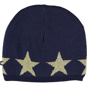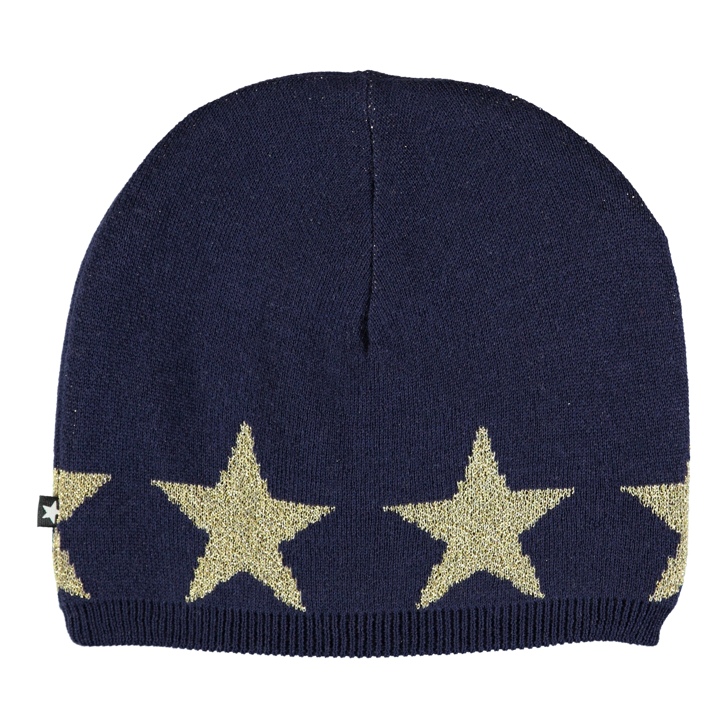 Dark blue hat in a soft wool blend with intarsia stars and a rib at the bottom.