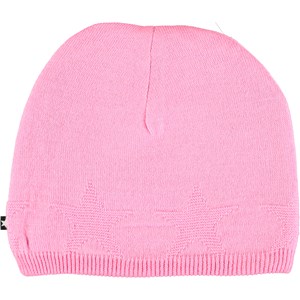 Pink hat in a soft wool blend with intarsia stars and a rib at the bottom.