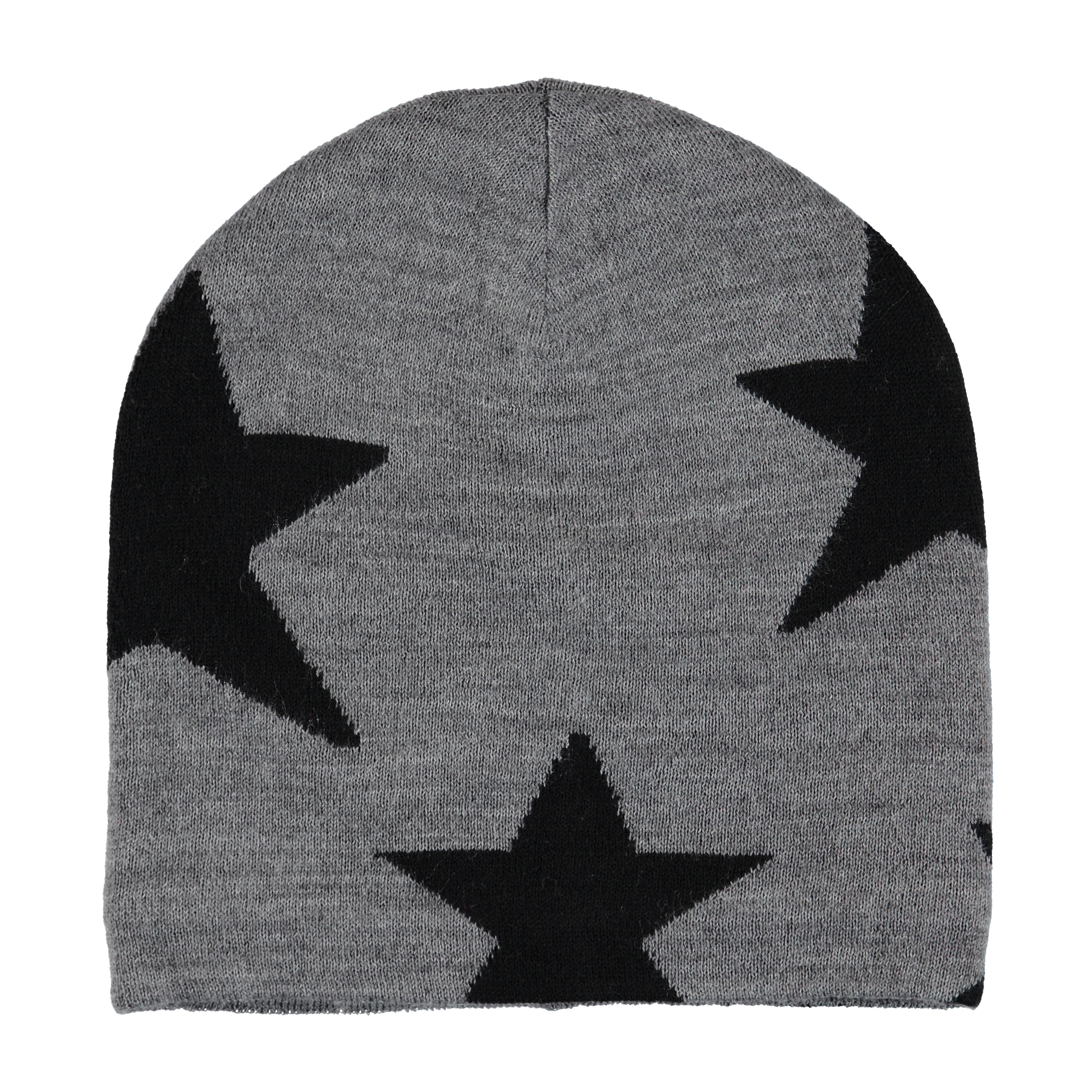 Black hat in a soft wool blend with intarsia stars and a rib at the bottom.