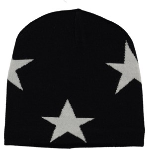 Black knit hat with intarsia stars med indstrikkede stjerner. The hat is constructed in a soft wool blend and has a rib edge.