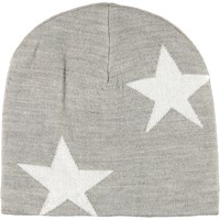 Green knit hat with intarsia stars. The hat is constructed in a soft wool blend and has a rib edge.