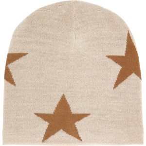 Off-white knitted beanie with a brown star pattern made from a soft wool blend.