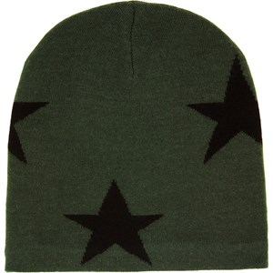 Dark grey knitted beanie with a black star pattern made from a soft wool blend.