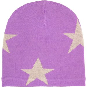 Purple knitted beanie with a beige star pattern made from a soft wool blend.