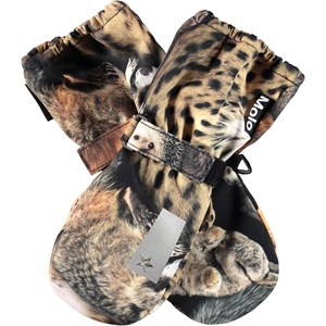 Waterproof and breathable mittens with a sleeping animal print and with 3M™ Thinsulate™ lining. The mittens have star reflectors on the top of the hand, elastic and adjustable velcro at the wrists. The outer fabric is made from 45% recycled polyester, the 3M™ Thinsulate™ padding from 78% recycled polyester and the lining from 100% recycled polyester. Please note that the cuff of this model is slightly longer than the one on Mitzy so that there is no gap between the mittens and the jacket sleeve. This product has a water resistant, PFC-free surface treatment (Does not contain, e.g. PFOS, PFOA, etc). Water column pressure: 10.000 mm. Breathable: 8.000 g/m2/24hr. Size 1-2 years has a zipper in the cuff instead of the Velcro strap.