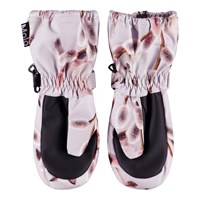 Light grey waterproof and breathable mittens with cat print, fleece lining and 3M™ Thinsulate™ insulation. The mittens have a reflector on the front, as well as elastic and adjustable velcro at the wrist. Note that the shaft on this model is slightly longer than on Mitzy, so that there is no opening at the jacket sleeve.