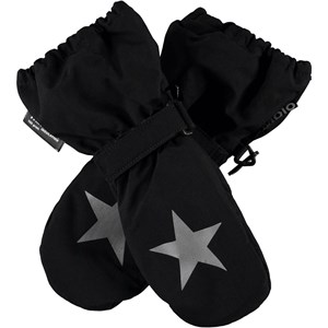 Black waterproof and breathable mittens with 3M™ Thinsulate™ insulation. They have star reflectors on the top of the hands as well as elastic and adjustable velcro at the wrists. The outer fabric is 51% recycled and made of recycled polyester. Note that the shaft on this model is slightly longer than on the Mitzy, so that there is no gap between the mitten and the jacket sleeve. The mittens have a water resistant, PFC-free surface treatment (Does not contain, e.g. PFOS, PFOA, etc). Water coloumn pressure: 10.000 mm and breathable: 8.000 g/m2/24hr. Sizes 1-2 years also have a zipper at the shaft.