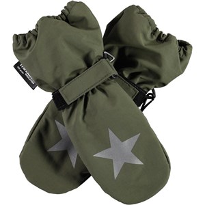 Green waterproof and breathable mittens with 3M™ Thinsulate™ insulation. They have star reflectors on the top of the hands as well as elastic and adjustable velcro at the wrists. The outer fabric is 51% recycled and made of recycled polyester. Note that the shaft on this model is slightly longer than on the Mitzy, so that there is no gap between the mitten and the jacket sleeve. The mittens have a water resistant, PFC-free surface treatment (Does not contain, e.g. PFOS, PFOA, etc). Water coloumn pressure: 10.000 mm and breathable: 8.000 g/m2/24hr. Sizes 1-2 years also have a zipper at the shaft.