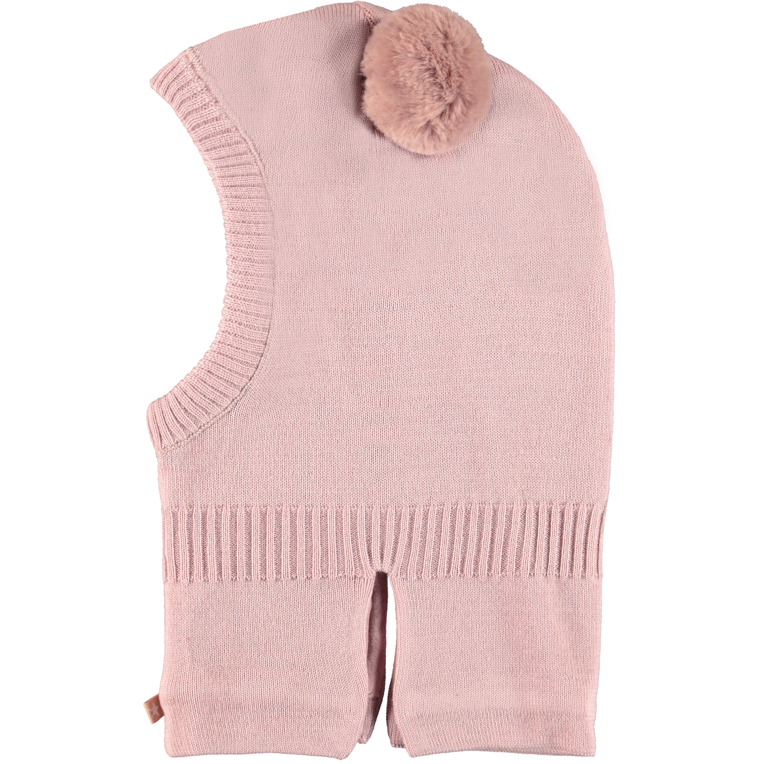 Pink knit ski mask in a wool blend. The hat has small faux fur pom poms as ears.