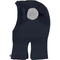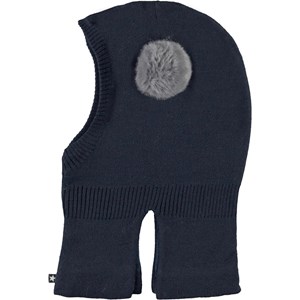 Dark blue knit ski mask with a sewn on faux fur pom pom.