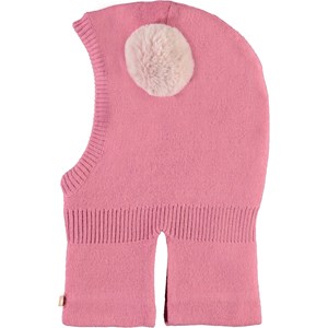 Pink knit ski mask with a sewn on faux fur pom pom.