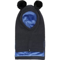 Dark grey knitted balaclava with faux-fur pom-poms. It has slits on the side of the neck so it fits well over the chest and shoulders. It is made from a soft wool blend and lined with plush material.