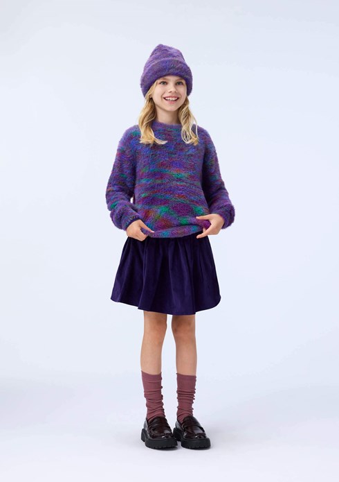 Purple fluffy beanie with multicolored yarn, roll up and a badge in front with the text 'Humankind - Being Kind to Humankind'
