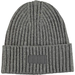Grey cable knit hat in a wool blend with a roll up edge. It has Molo's logo on the front.