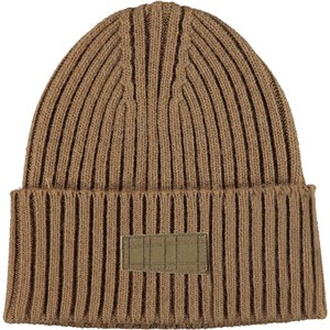 Beige cable knit hat in a wool blend with a roll up edge. It has Molo's logo on the front.