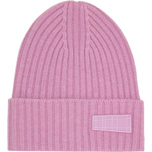 Pink ribbed knit beanie with roll up and Molo's logo on the front.
