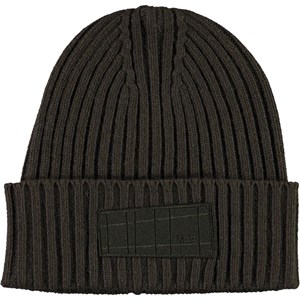 Cable knit hat in a green wool blend with a roll up at the bottom and Molo's logo on the front.