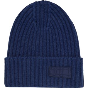 Dark blue ribbed knit beanie with roll up and Molo's logo on the front.