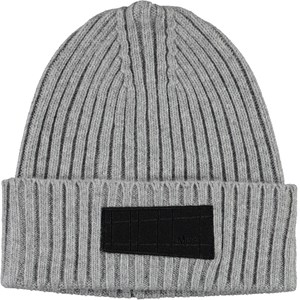 Cable knit hat in a grey wool blend with a roll up at the bottom and Molo's logo on the front.