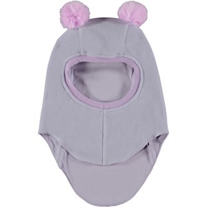 Light purple balaclava with small pom pom ears. It is really soft and keeps the head and neck warm.