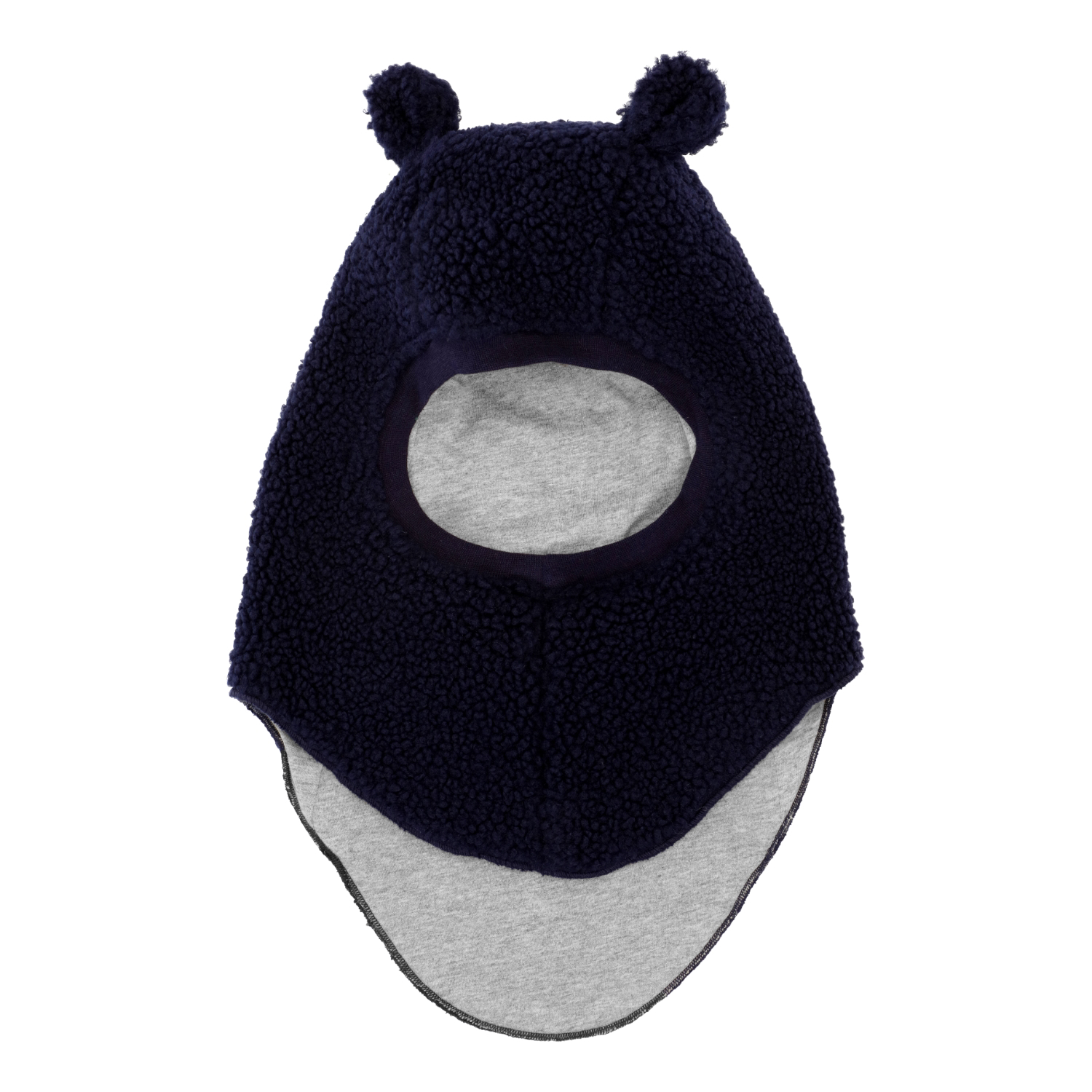 Dark blue balaclava with cute teddy bear ears for babies and toddlers. It is in soft teddy fleece and is perfect for keeping the neck, head, and ears warm on chilly days. The balaclava is lined with soft grey melange jersey lining.