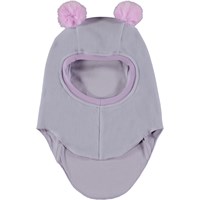 Dark green balaclava with small pom pom ears. It is really soft and keeps the head and neck warm.