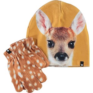 Matching hat and glove set with a print of deer. S/M: 3-6 years. M/L: 7-12 years.