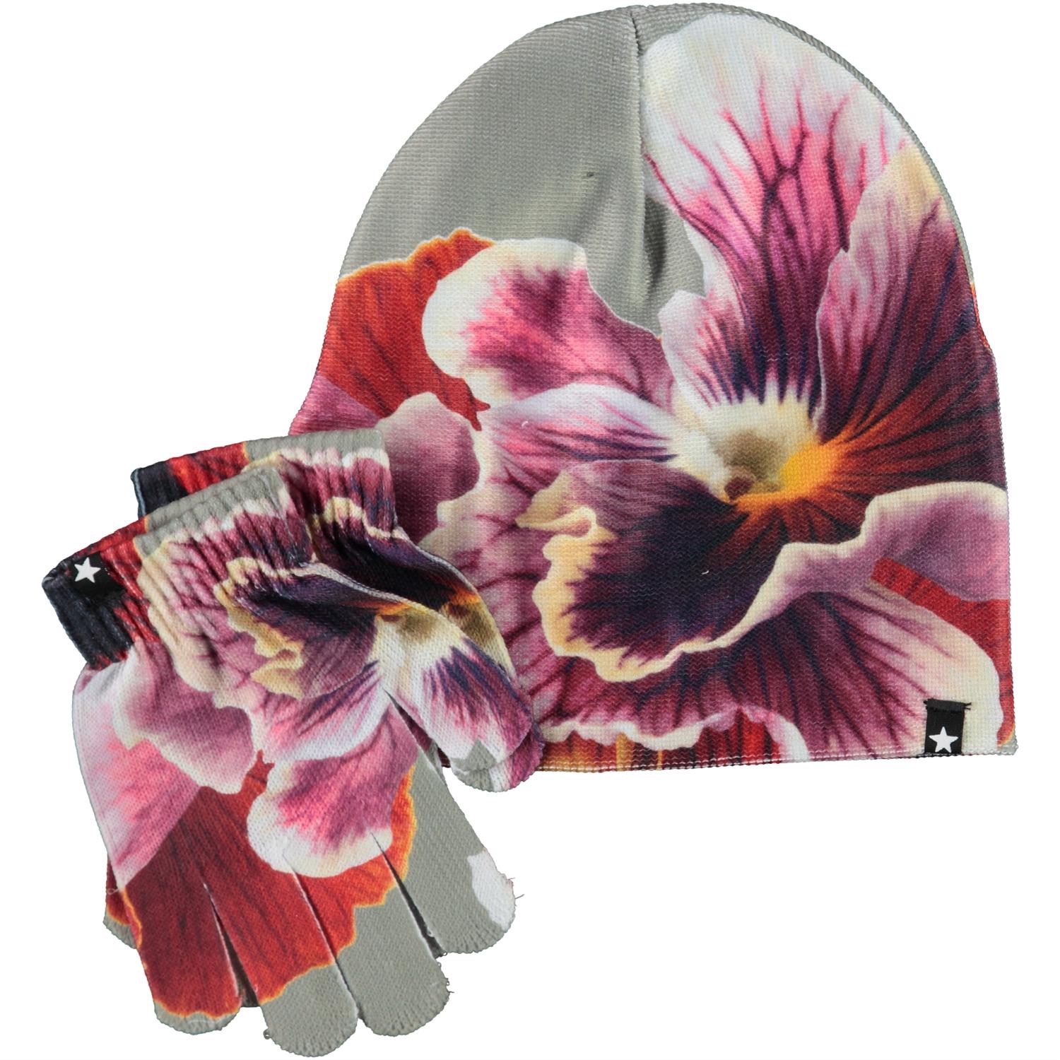 Matching hat and glove set in grey with a floral print. S/M: 3-6 years. M/L: 7-12 years.