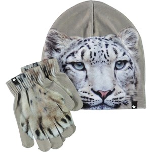 Matching hat and glove set in grey with a print of snow leopards on the hat and a print of paws on the gloves. S/M: 3-6 years. M/L: 7-12 years.