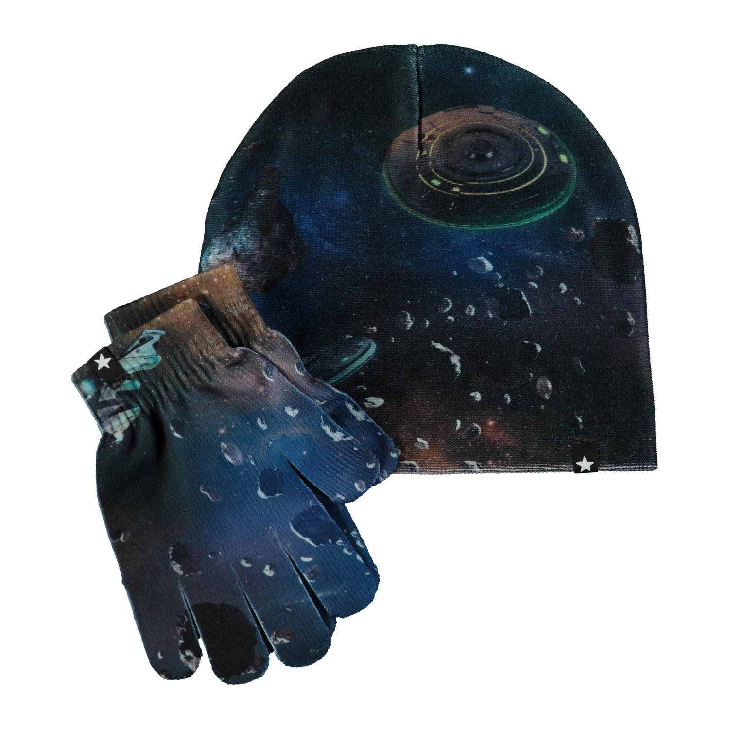 Matching set of hat and gloves in blue with a UFO print. Size S/M 3-6 years. Size M/L 7-12 years.