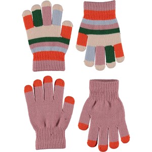 Two pair knit gloves. One pair is in a rose colour with orange finger tips, and the other has wide pastel coloured stripes.