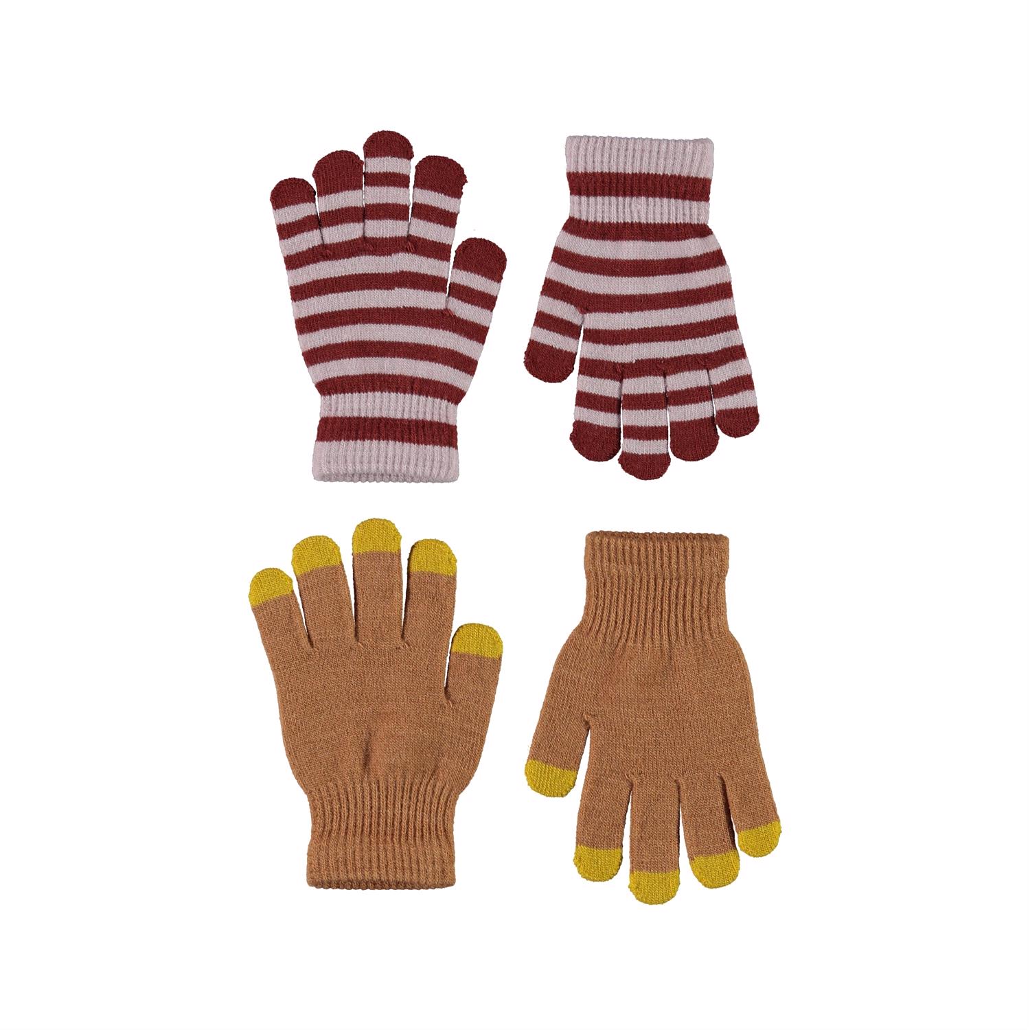 2 pairs of knit gloves. One pair is in beige with light yellow finger tips, while the other is in rose and dark red stripes.