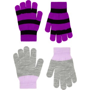 2-pack of knitted gloves. One pair is grey with pink details, while the other pair is striped in black and purple. The gloves have a ribbed cuff around the wrist, making them comfortable to wear and preventing them from slipping off the hand.
