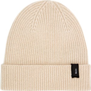 Off-white rib-knit woolen beanie with Molo's logo on the roll up.