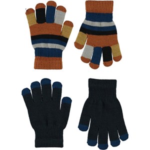 2 pairs of knit gloves. One pair is in dark blue with blue finger tips, while the other is striped.
