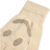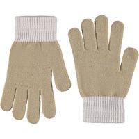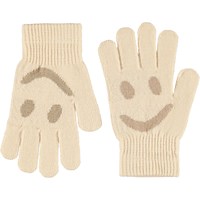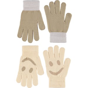 2-pack of knit gloves for slightly older children. One pair is gray and khaki, while the other is off-white with a smiling face. The gloves feature a ribbed cuff at the wrist, making them comfortable to wear and ensuring they stay in place.