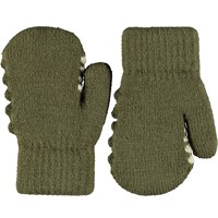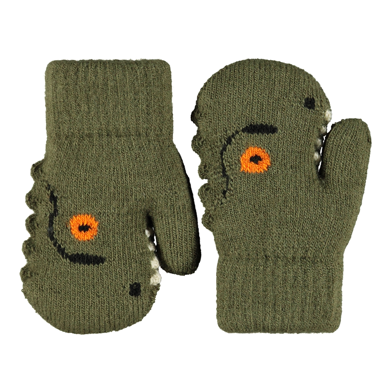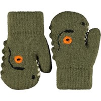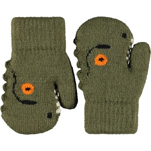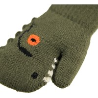 Dark green knitted mittens for the little ones with a dinosaur face. The mittens have a ribbed cuff around the wrist, to keep them in place, as well as a soft fleece lining to keep hands warm.