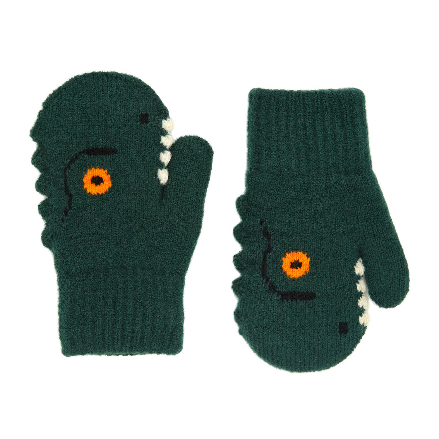 Dark green knitted mittens for babies and toddlers with a crocodile face. The mittens have a ribbed cuff around the wrist, which ensures a secure fit, as well as a soft fleece lining that keeps the hands warm.