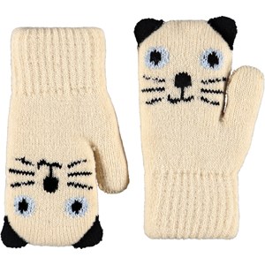 Off-white knitted mittens for the little ones with a cute cat face. The mittens have a ribbed cuff around the wrist, to keep them in place, as well as a soft fleece lining to keep hands warm.