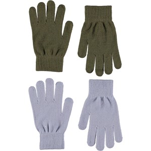 Two pair knit gloves. One pair is green, and the other is light purple.