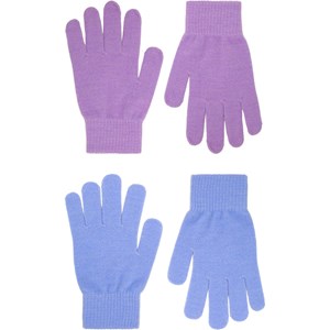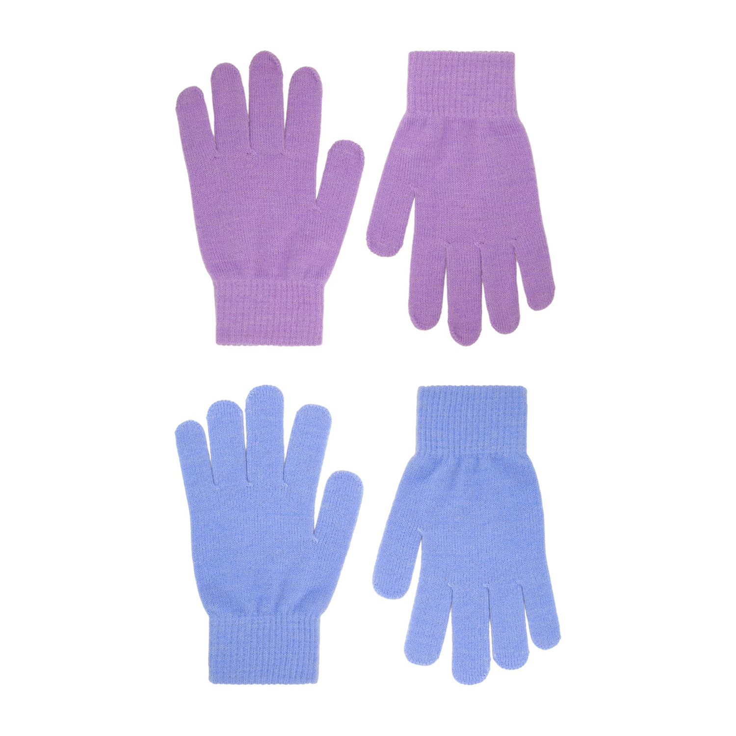 2-pack of knitted gloves in lavender blue and purple. The gloves have a ribbed cuff around the wrist, making them comfortable to wear and preventing them from slipping off the hand.