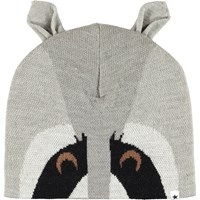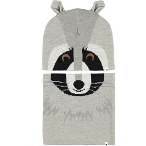 Grey hat and infinity scarf in a wool blend with a motif of an adorable racoon that covers both the hat and the scarf.