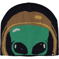 Black hat and infinity scarf in a wool blend with an alien motif, which is partially on the hat and partially on the scarf.
