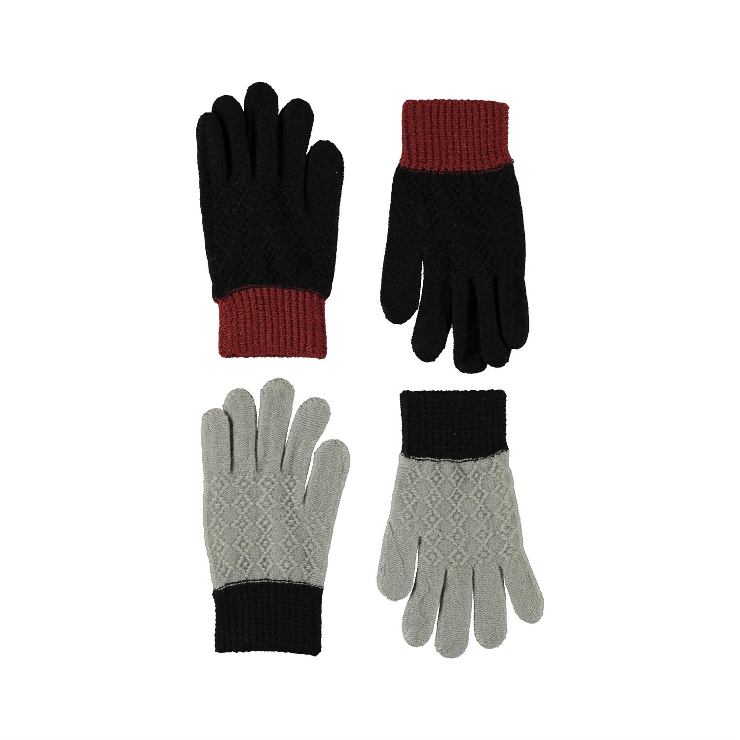 2 pairs of knit gloves with a lovely knit pattern on the top of the hands. One pair is in grey, while the other is in black.