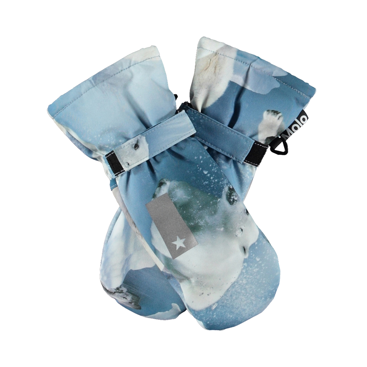 Blue, waterproof and breathable mittens with polar bear print and 3M™ Thinsulate™ insulation. The mittens have a reflector on the front, as well as elastic and adjustable Velcro at the wrist. Features: Water-repellent PFC-free impregnation Water column pressure: 15,000 mm. Breathability: 15,000 g/m2/24h 3M™ Thinsulate™ insulation Please note that sizes 1-2 years have a zipper in the shaft instead of a Velcro closure.
