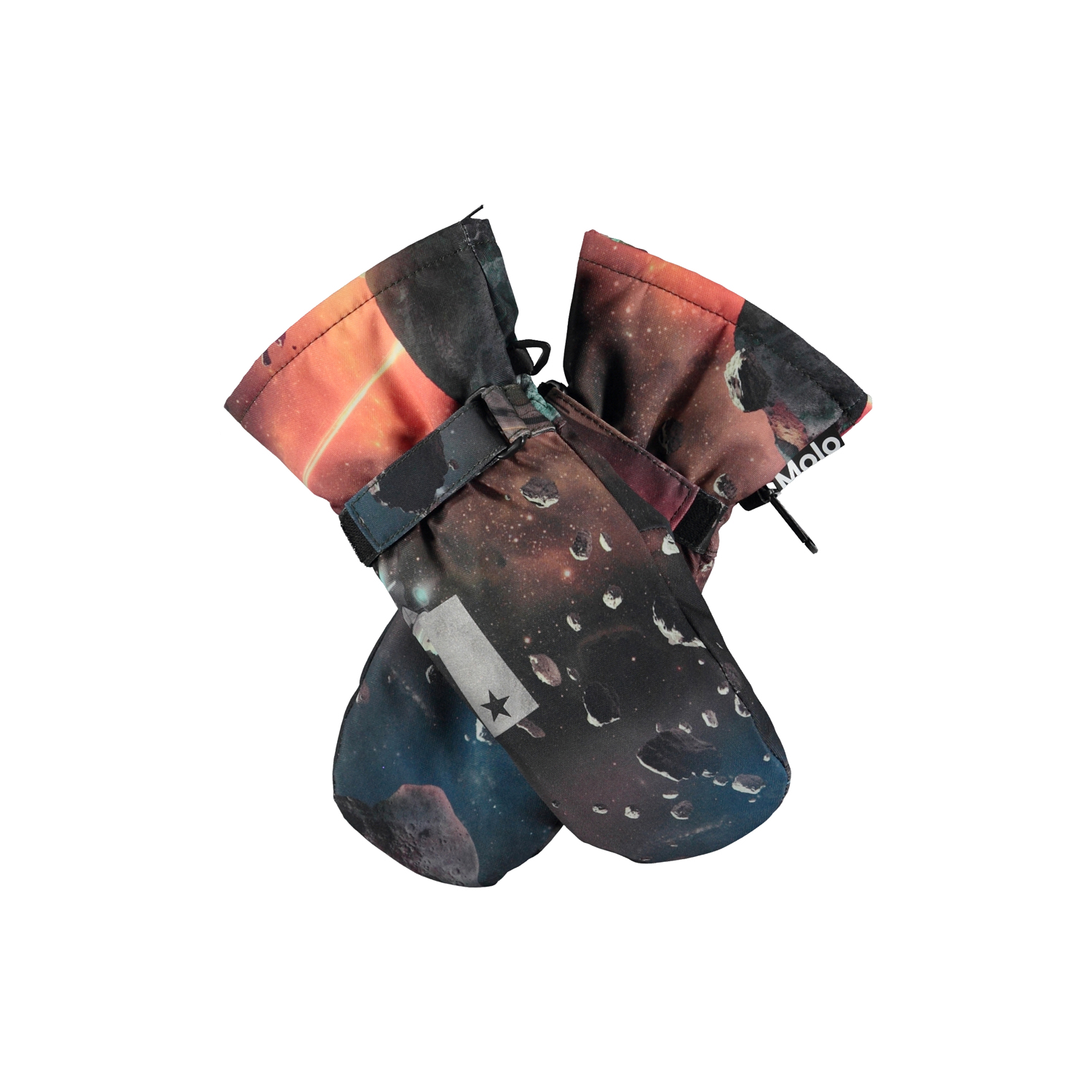 Winter mittens for really cold days with a print of planets and spaceships. There is a black rubber coating on the inside of the palms and on the thumbs for easy gripping. The mittens are great for all kinds of weather and perfect for ski trips. These mittens match the prints and colours of Molo’s outerwear.