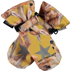 Waterproof, breathable mittens with 3M™ Thinsulate™ insulation. They are in yellow with a deer print and with star reflectors on top of the hand. They have elastic and adjustable velcro at the wrists. The outer fabric is 51% recycled and made of recycled polyester. The mittens have a water resistant, PFC-free surface treatment (Does not contain, e.g. PFOS, PFOA, etc). Water coloumn pressure: 10.000 mm and breathable: 8.000 g/m2/24hr.