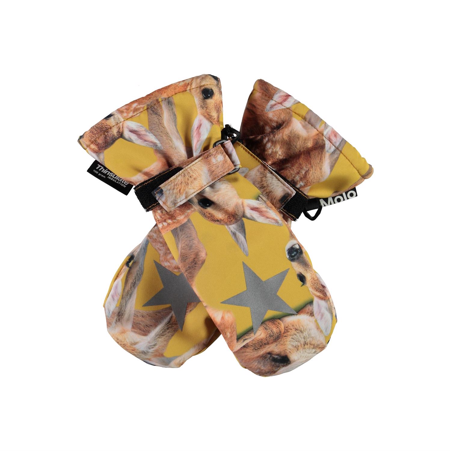 Waterproof, breathable mittens with 3M™ Thinsulate™ insulation. They are in yellow with a deer print and with star reflectors on top of the hand. They have elastic and adjustable velcro at the wrists. The outer fabric is 51% recycled and made of recycled polyester. The mittens have a water resistant, PFC-free surface treatment (Does not contain, e.g. PFOS, PFOA, etc). Water coloumn pressure: 10.000 mm and breathable: 8.000 g/m2/24hr.