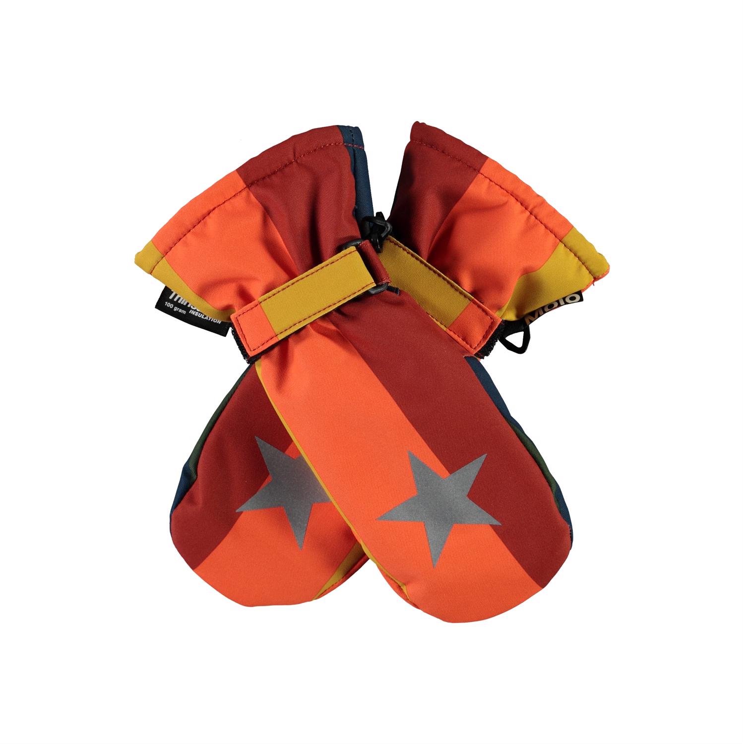 Waterproof, breathable mittens with 3M™ Thinsulate™ insulation. They are in a rainbow print and have star reflectors on top of the hand. They have elastic and adjustable velcro at the wrists. The outer fabric is 51% recycled and made of recycled polyester. The mittens have a water resistant, PFC-free surface treatment (Does not contain, e.g. PFOS, PFOA, etc). Water coloumn pressure: 10.000 mm and breathable: 8.000 g/m2/24hr.