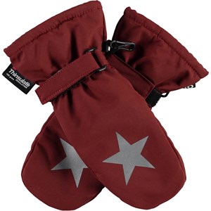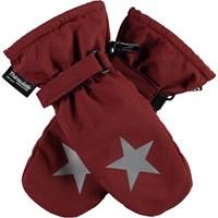 Waterproof, breathable mittens with 3M™ Thinsulate™ insulation. They are in dark red and have star reflectors on top of the hand. They have elastic and adjustable velcro at the wrists. The outer fabric is 51% recycled and made of recycled polyester. The mittens have a water resistant, PFC-free surface treatment (Does not contain, e.g. PFOS, PFOA, etc). Water coloumn pressure: 10.000 mm and breathable: 8.000 g/m2/24hr.